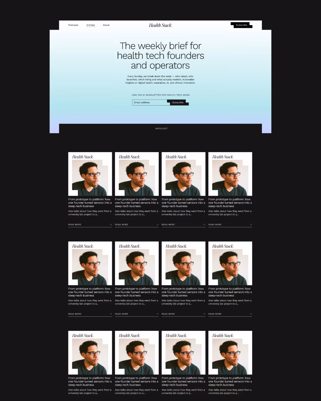 Health Stack is a Podcast, Newsletter and all round news that exists to give founders, operators and investors who are building in digital health access to the tools, knowledge and people that enable them to thrive.